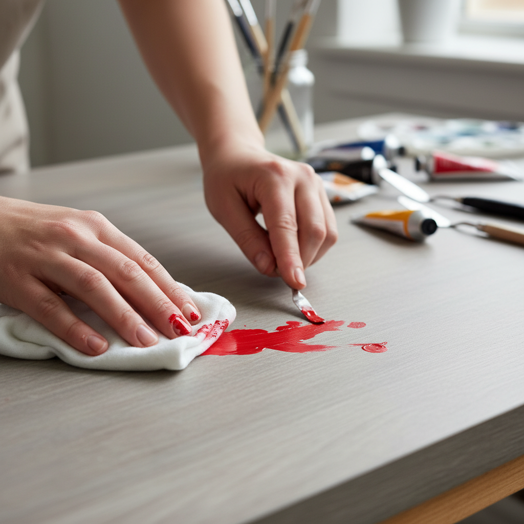 • Flüssigkeit aufsaugen: Wischen Sie die frische Farbe sofort mit einem feuchten Tuch auf.