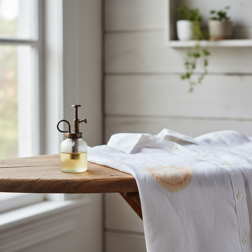 Wasserstoffperoxid (3%ige Lösung) ist ein wirksames Mittel, kann aber auf farbigen oder empfindlichen Stoffen Bleichspuren hinterlassen. Es sollte immer zuerst an einer unauffälligen Stelle getestet werden. Für weiße Baumwolle ist es oft sehr effektiv.