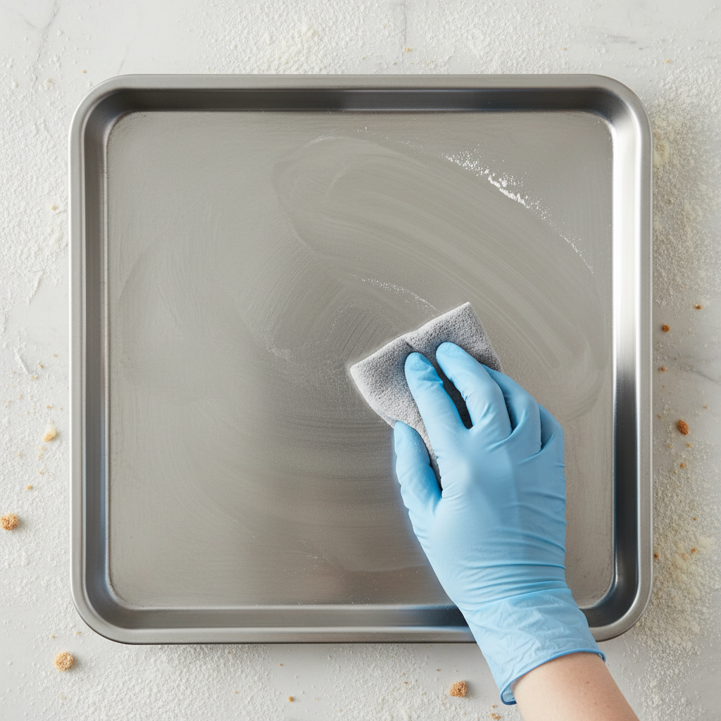 - Wählen Sie die Reinigungsmethode passend zum Material Ihres Backblechs (Emaille, Antihaft, Edelstahl, Aluminium).