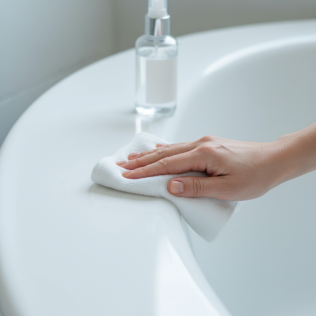 A professional, high-resolution close-up photo of a pristine white bathtub surface being gently polished. A clean hand, visible in the lower right, holds a soft, light-colored microfiber cloth. A small, subtle scratch is visible on the tub surface just before the area being polished. The cloth has a pea-sized dab of white, non-gel toothpaste applied to it. The hand is performing a soft, circular motion, implying the removal of the scratch. The focus is on the action and the potential for restoration, with the bathtub surface appearing exceptionally clean and glossy in the background.