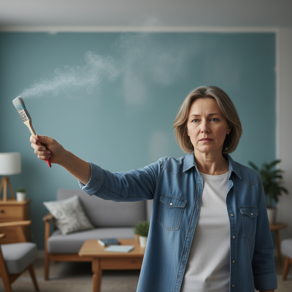 A cozy apartment living room, freshly painted but with a palpable, unpleasant lingering chemical odor. Invisible, swirling greenish-grey wavy lines emanate subtly from the walls, filling the air and making it feel heavy. A person in the background, partially obscured, is gently pinching their nose, looking subtly uncomfortable. The overall atmosphere feels stagnant and unwelcoming despite the new paint. Style: Modern flat illustration with a slightly desaturated color palette, conveying a sense of discomfort.