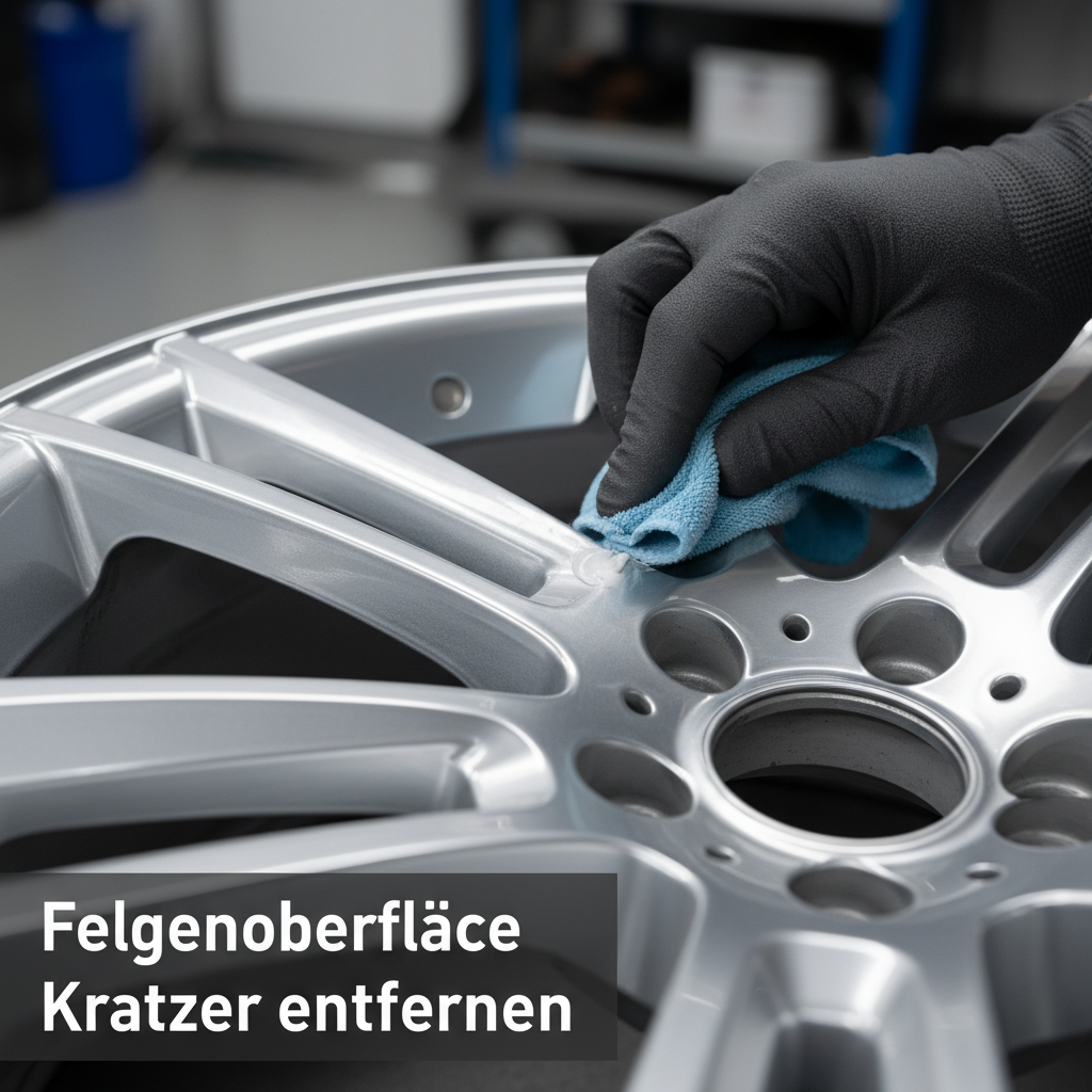 • Politur: Spezielle Felgenpolituren oder Autopolituren können feine Kratzer auffüllen und die Oberfläche glätten. Tragen Sie die Politur mit einem weichen Mikrofasertuch auf und polieren Sie die betroffene Stelle in kreisenden Bewegungen.
