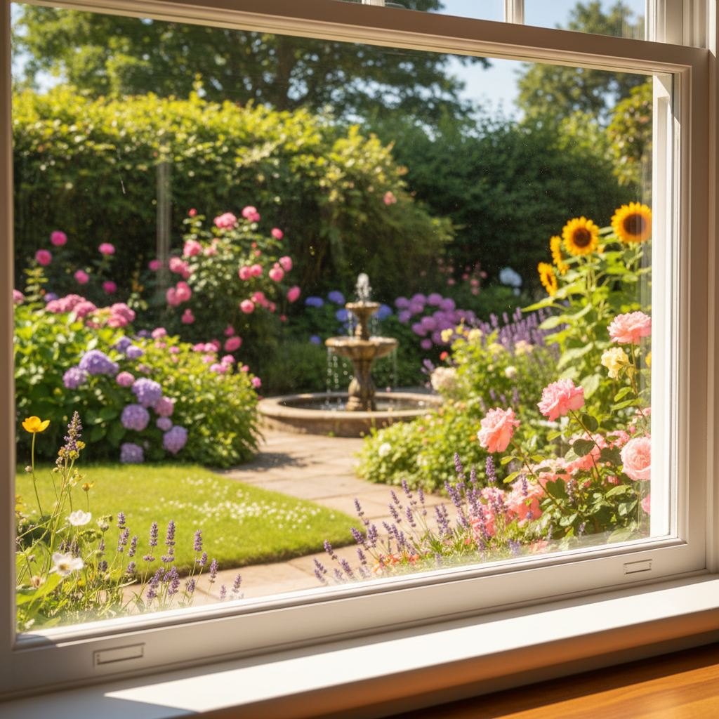 A bright, sunny room with pristine, streak-free windows revealing a vibrant outdoor scene (e.g., a green garden or a city skyline). Sunlight streams through, illuminating dust motes in the air, but the window itself is impeccably clear. The overall mood is fresh, airy, and inviting. Professional photo, natural lighting, high dynamic range.