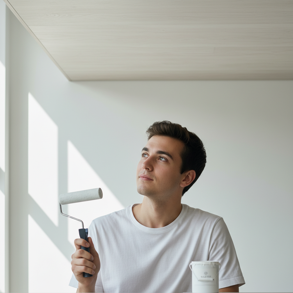 A bright, airy room with an old, stained wooden plank ceiling on one side, transitioning seamlessly into a freshly painted, smooth white ceiling on the other. A person is seen from the back, on a stable step ladder, using a long-handled paint roller to apply the final coat of paint to the unpainted section. Sunlight streams through a window, illuminating the stark contrast between the dull, aged wood and the vibrant, modern white. Professional photo with a clean, aspirational aesthetic.