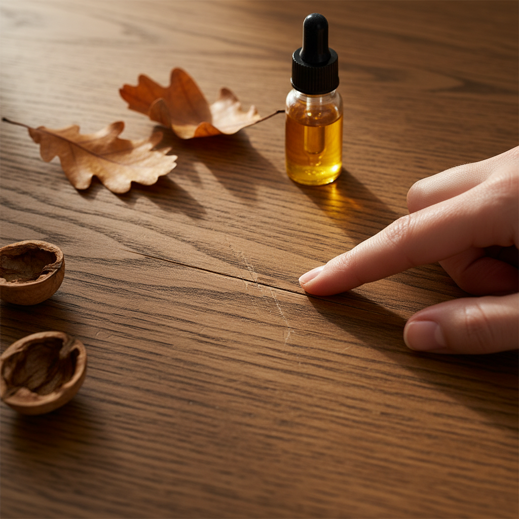 - Walnüsse oder Paranüsse: Diese Methode ist erstaunlich wirksam für helle bis mittelbraune Hölzer. Reiben Sie mit der Nussöl-haltigen Innenseite einer geschälten Walnuss oder Paranuss über den Kratzer. Das natürliche Öl füllt den Kratzer auf und dunkelt ihn optisch auf. Polieren Sie anschließend mit einem weichen Tuch nach. Diese Methode funktioniert am besten bei sehr feinen, oberflächlichen Kratzern.