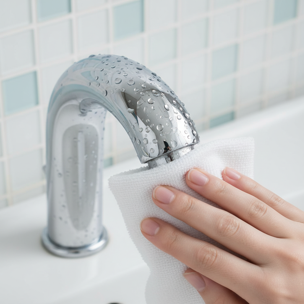 - Trocknen: Trocknen Sie den Wasserhahn mit einem weichen Mikrofasertuch ab. Dies verhindert neue Wasserflecken und sorgt für Glanz.