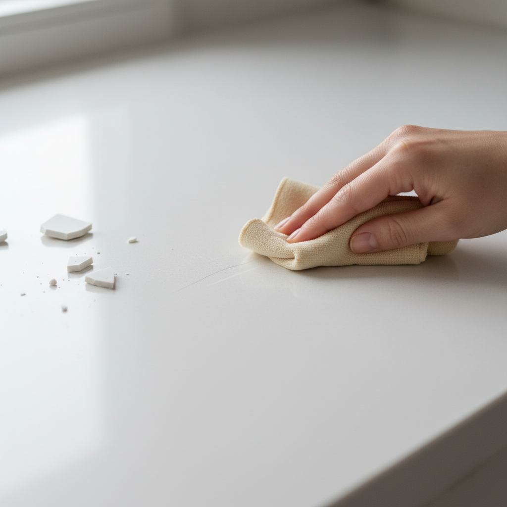 • Entfernung von Kratzern: Oberflächliche Kratzer können oft mit speziellen Arbeitsplatten-Reinigungspasten behandelt werden. Für tiefere Kratzer sind Reparatur-Kits für Quarzkomposit oder Keramik erhältlich, die oft eine Harzmasse zum Füllen des Kratzers enthalten.