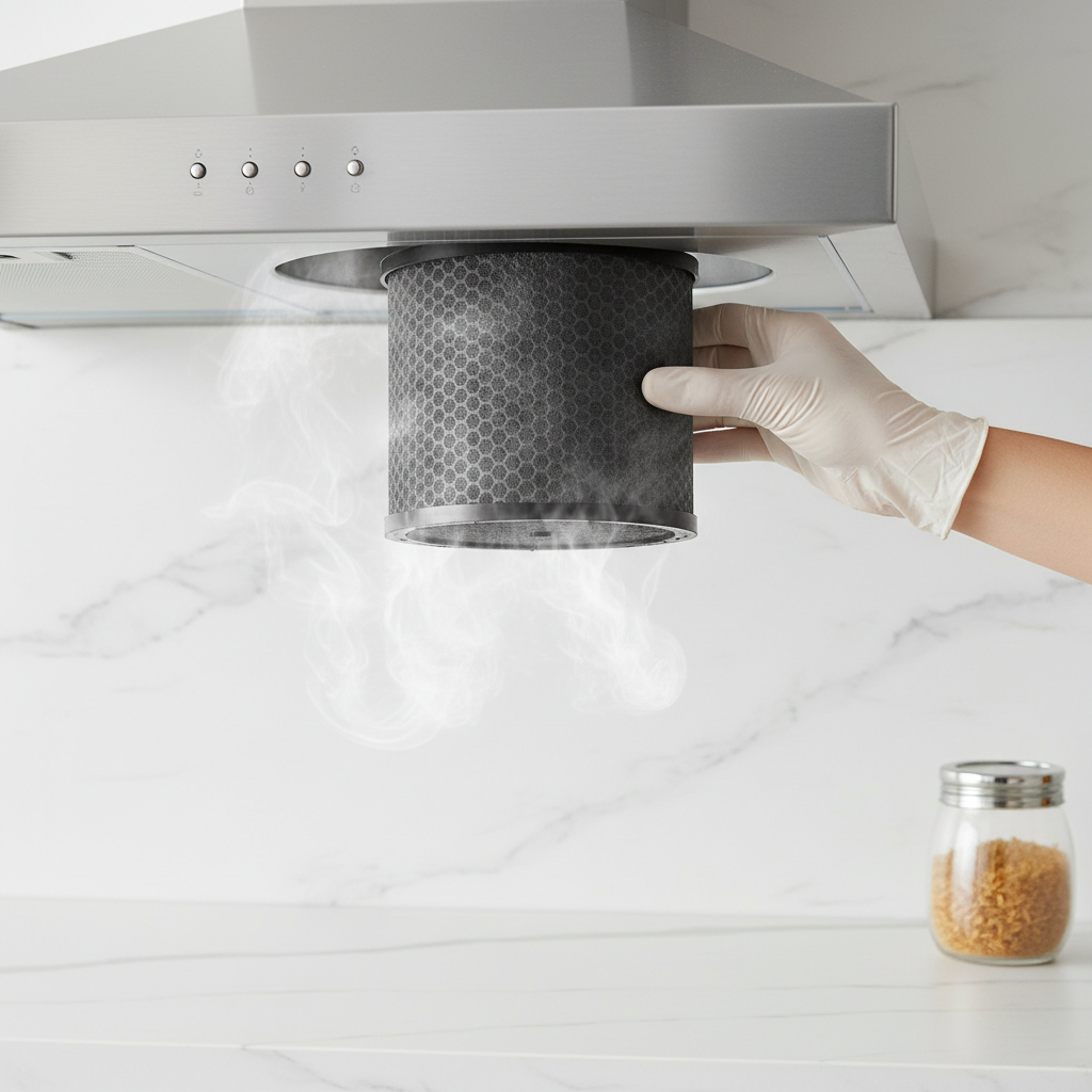 Die Hauptfunktion eines Kohlefilters in einer Dunstabzugshaube ist die Adsorption von Gerüchen und feinen Fettpartikeln aus der Küchenluft. Er reinigt die Luft, bevor sie bei Umluftsystemen wieder in den Raum geblasen wird, und trägt so zu einer frischeren Küchenatmosphäre bei.