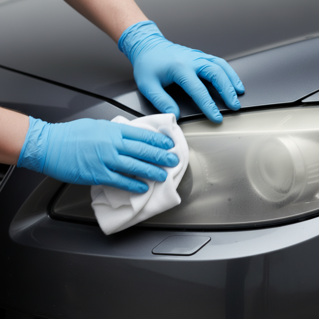 - Vorbereitung: Reinigen Sie die Scheinwerfer gründlich. Kleben Sie empfindliche Lackteile am Fahrzeugrand mit Klebeband ab, um Beschädigungen zu vermeiden.