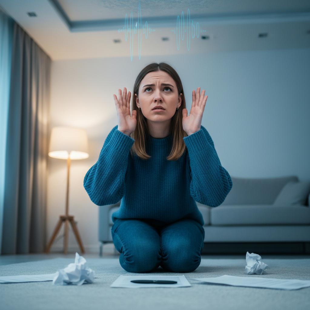 A professional flat illustration depicting a cross-section of two apartment floors. In the lower apartment, a person is trying to relax, perhaps reading or watching TV, but looks visibly annoyed or stressed. From the ceiling above them, subtle, semi-transparent sound wave symbols are emanating downwards. On the floor of the upper apartment, abstract, blurred shapes suggest movement or impact, like footsteps or an object falling, causing the sound. The overall atmosphere conveys interrupted peace.