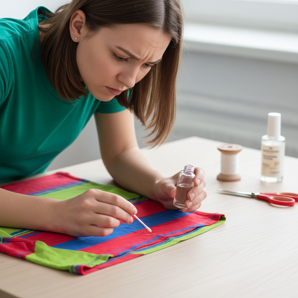 - Testen: Tragen Sie eine kleine Menge Aceton (oder acetonhaltigen Nagellackentferner) auf eine Innenseite des Kleidungsstücks auf (z. B. Saum oder eine Nahtinnenseite). Warten Sie einige Minuten und prüfen Sie auf Farbveränderungen oder Faserschäden.