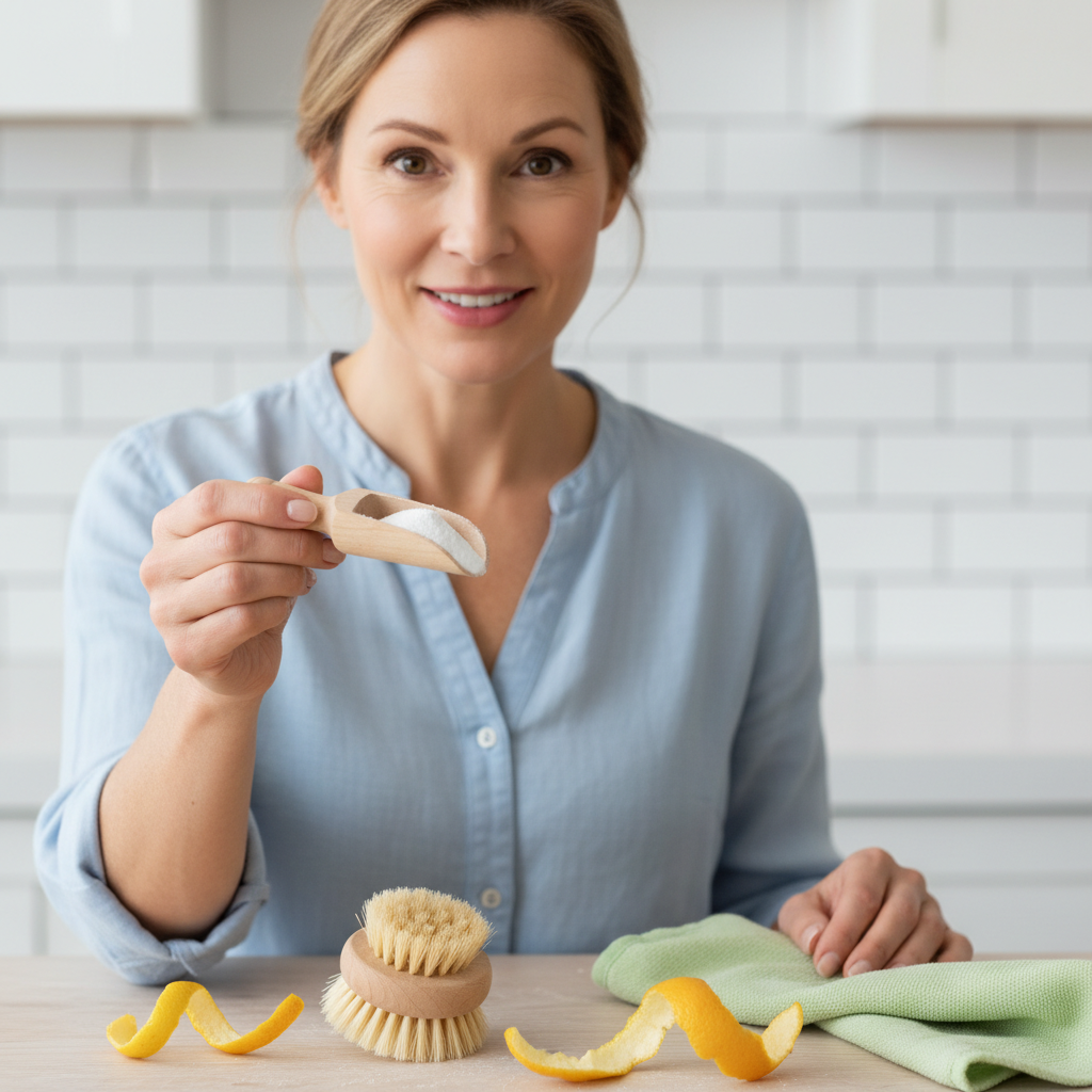 A professional, bright top-down photo capturing a moment of natural cleaning. In the foreground, a small white ceramic bowl filled with fine, white baking soda powder. Next to it, a wooden spoon, a slice of lemon, and a natural scrubbing brush or sponge. In the background, slightly out of focus but still discernible, are elements of a sparkling clean kitchen counter and a gleaming stainless steel sink faucet, suggesting the successful application of the product. The lighting should be soft and natural, emphasizing purity and effectiveness.